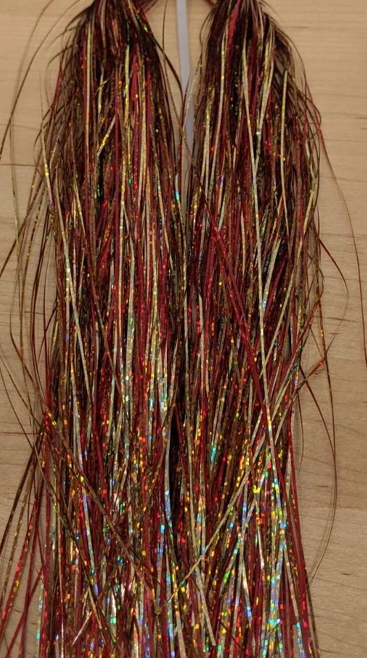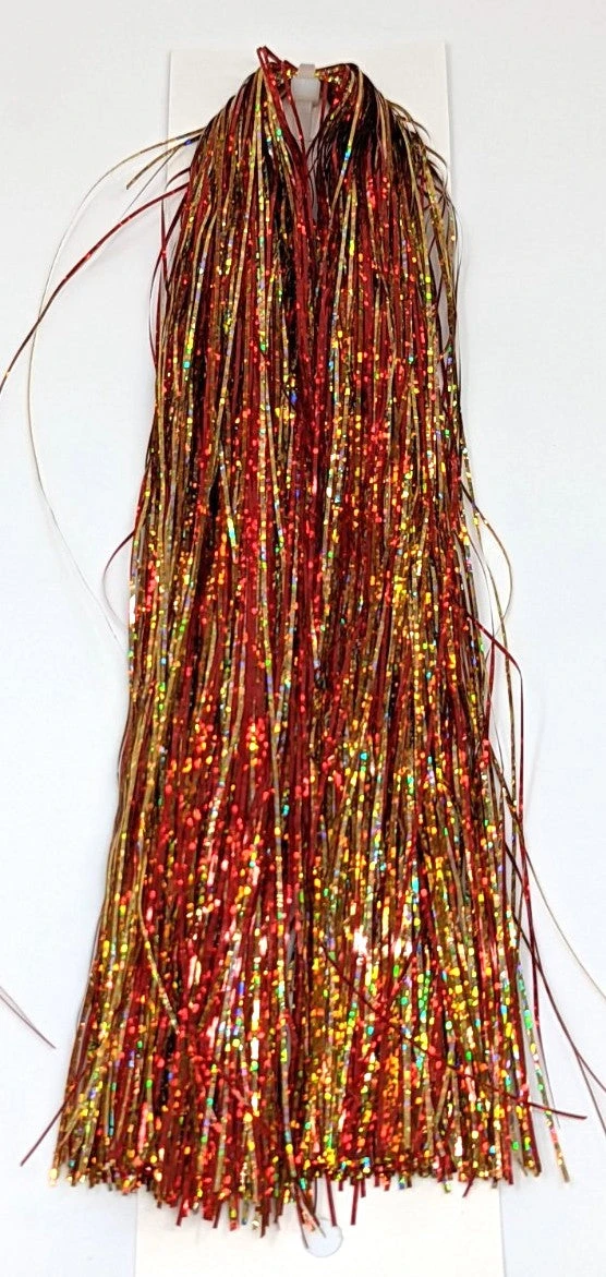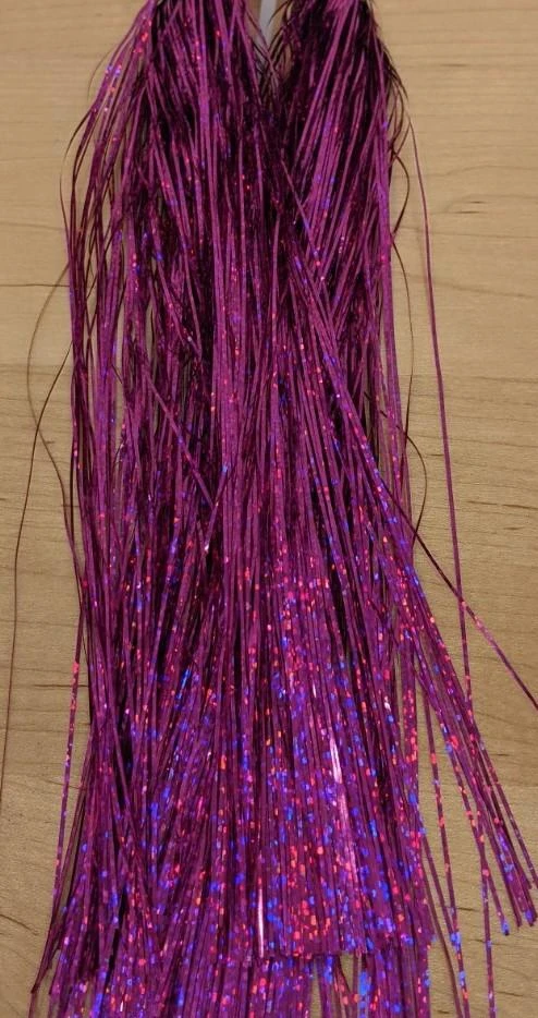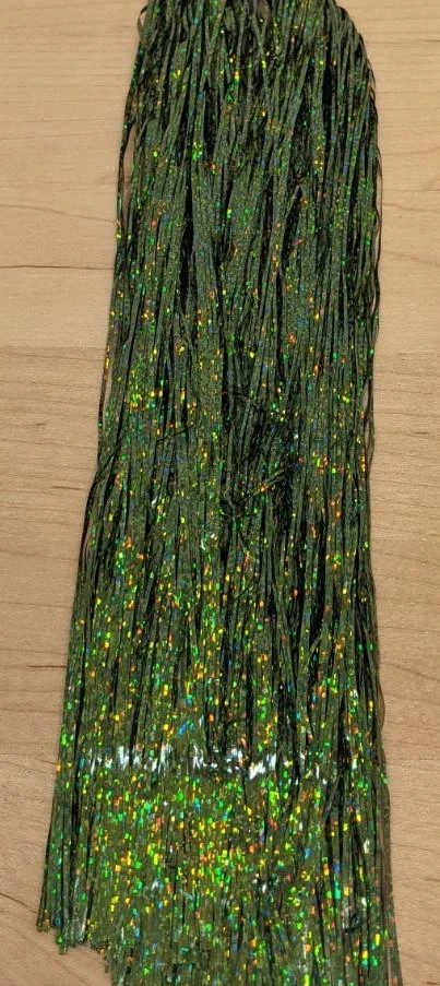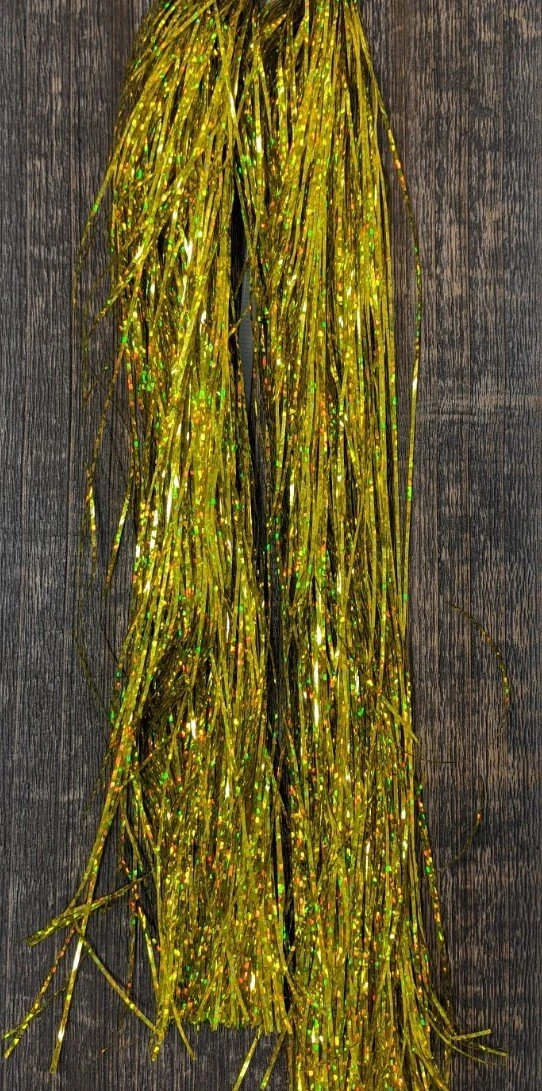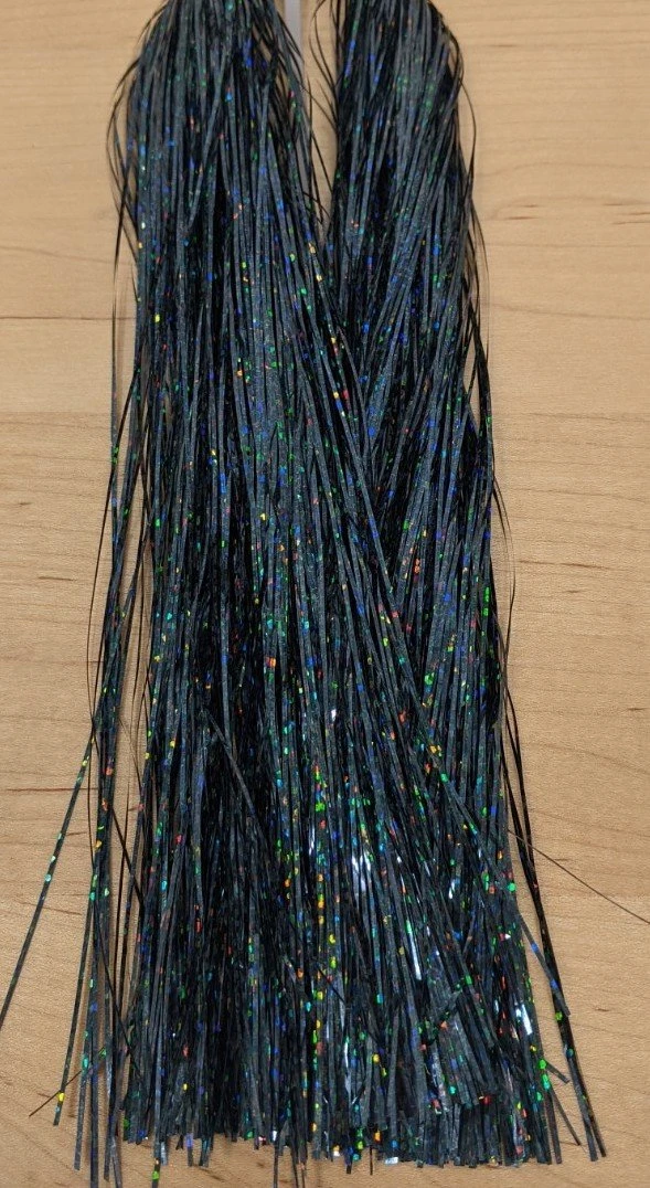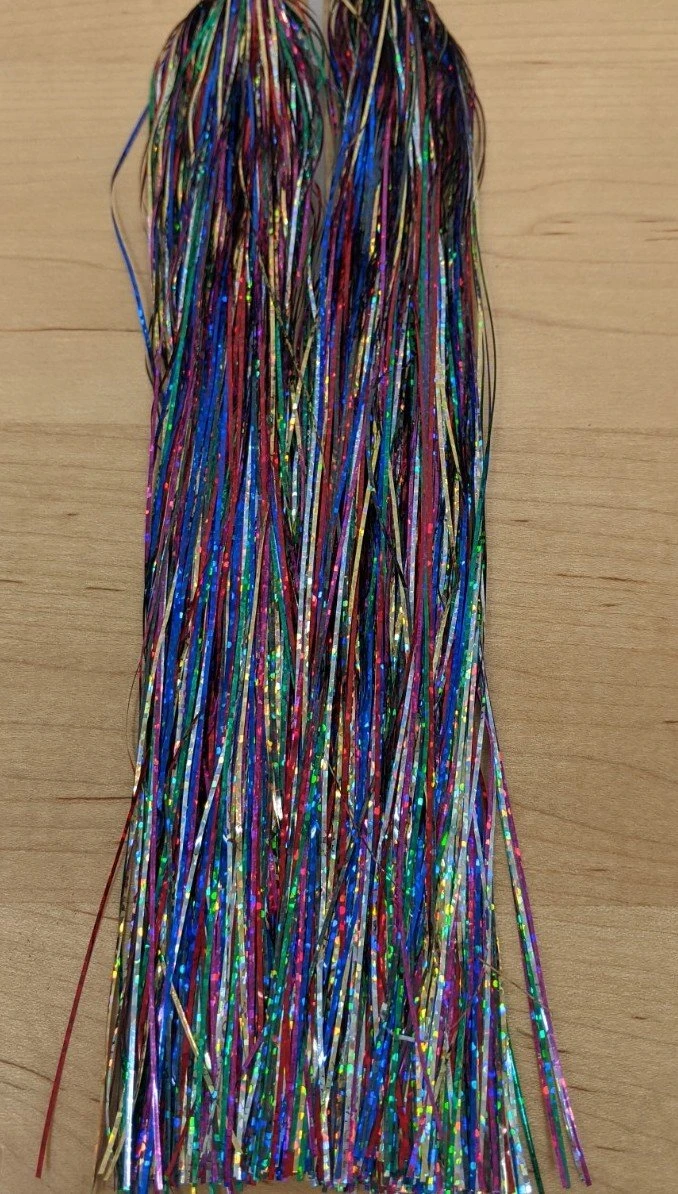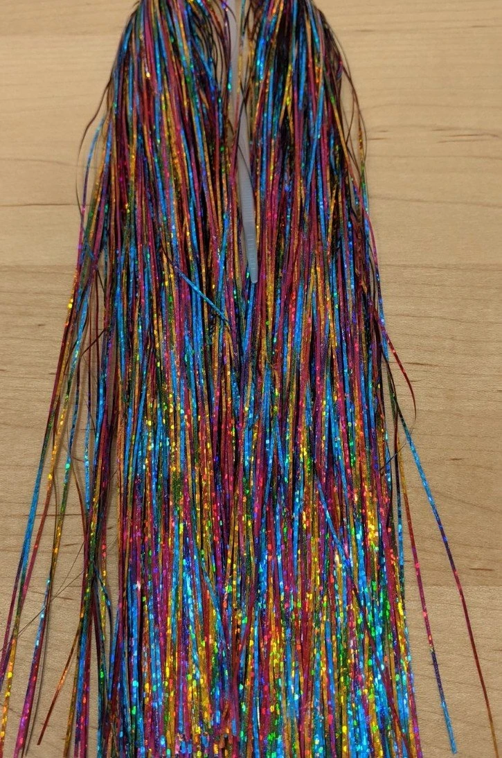 Flashabou Holographic Magnum – 1/32″ wide. Perfect flash for larger streamers, saltwater flies, and pike and musky flies. Made by Hedron Flashabou
