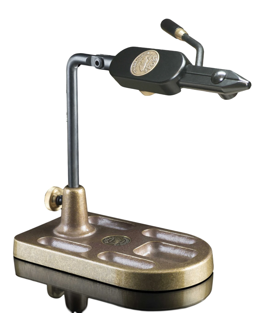 Regal Medallion Series Shank Head Vise with Bronze Pocket Base – This may be the most versatile FLY TYING VISE HEAD ever produced. Our Shank head is designed to hold Shanks, Tube Pins, and hooks from size 16 to 1/0. The left side of the head feature two hook grooves, the right side has a horizontal pin groove, and the jaw is a blunted perfectly for holding shanks. This is the HEAD for tying tube, articulated, and Game Changer style flies.