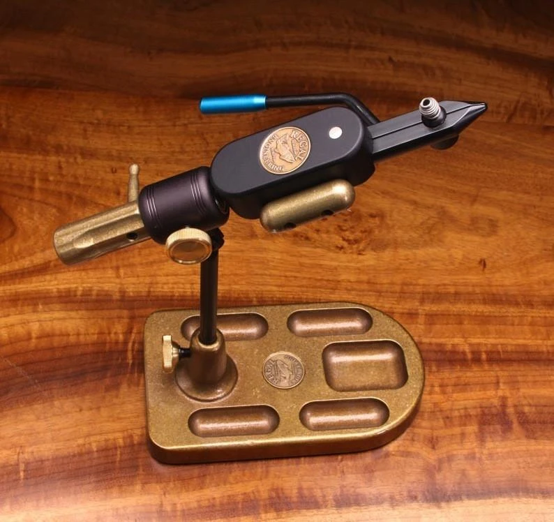Regal Revolution Vise is the ultimate Regal Fly Tying Vise. Full Rotary head. Heavy bronze base keeps the vise anchored on the bench. This model comes with the traditional jaw. The traditional jaws tie size 18-3/0 hooks. A heavy duty big game jaw can be purchased separately. model# 200-10P