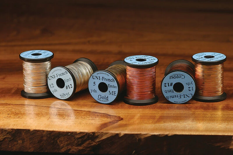 Uni Embossed Flat French Tinsel – Metal Tinsel embossed to add texture. Used on classic flies, salmon flies, and steelhead patterns.
