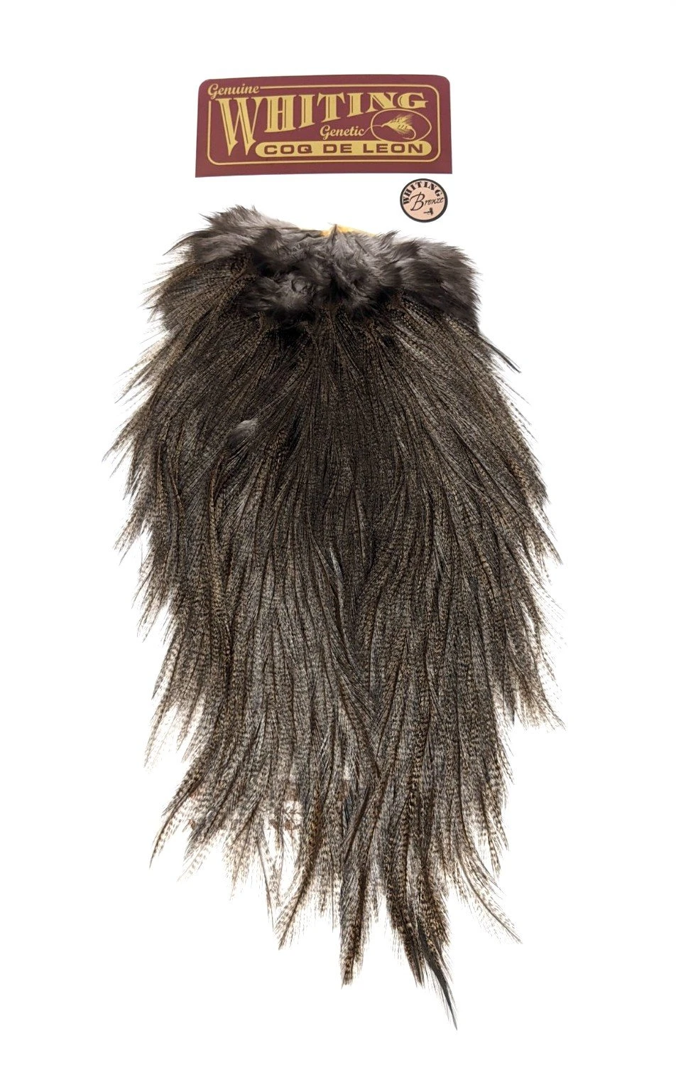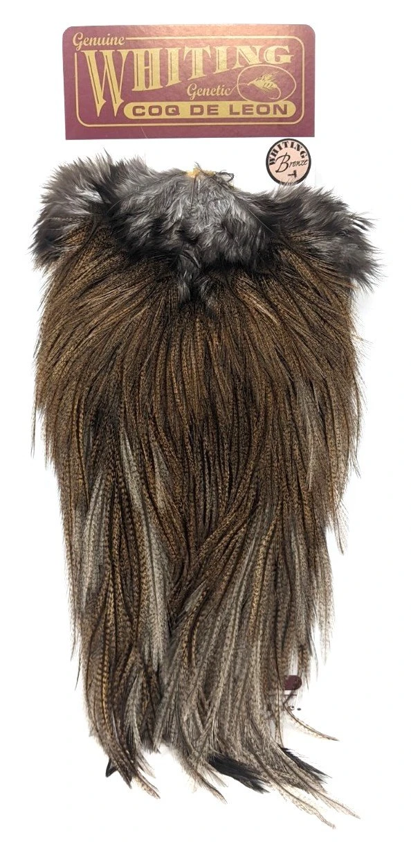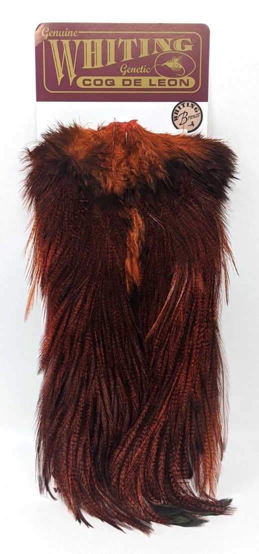 Whiting Coq de Leon Bronze Saddles are full of barred feathers that can be used for tailing dry flies and nymphs. The long saddle feathers can also be used as wings or palmered for a unique hackle on streamers and wets.